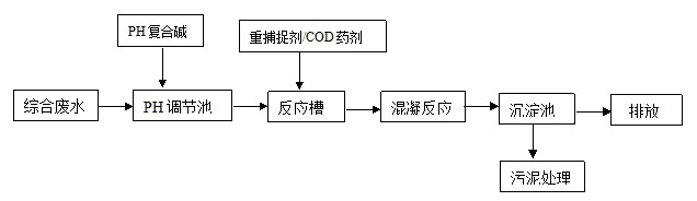 包含普通含銅廢水、酸堿廢水、處理后的油墨廢水等。污染物有銅、氨氮、COD等。與多數其他行業廢水類似,普遍采用化學法處理,采用藥劑主要有用到PH中和粉、重金屬捕捉劑、COD降解劑。重金屬捕捉劑和COD降解劑可根據殘余重金屬和COD的濃度添加,處理工藝流程如下: